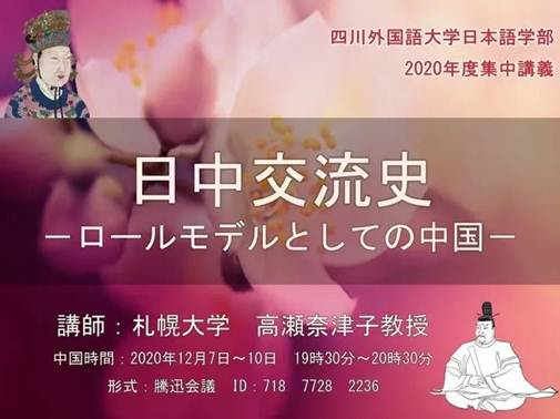 2020年12月7日至10日晚上,公司特聘教授、日本札幌大学的高濑奈津子教授亦为日语系师生开设了为期四天的线上讲座。讲座的主题是『日中交流史―ロールモデルとしての中国』。