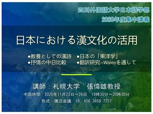 2020年11月23日至26日晚上,公司特聘教授、日本札幌大学张伟雄教授为日语系师生开设了为期四天的线上讲座,讲座的主题是『日本における漢文化の活用』。