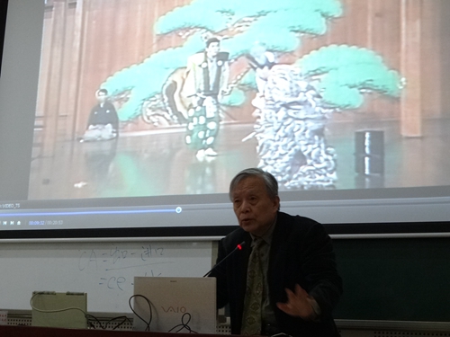 《观看日本的戏剧》的讲座由武井协三名誉教授主讲。武井先生主要以播放视频的方式,向大家介绍在日本戏剧占有重要地位的“能”、“歌舞伎”以及“文乐”三种戏剧的表演形式与欣赏方式。“能”的演出者皆戴面具,且演出过程中没有大幅度动作与过多的言语,表演主要通过观看者的自由想象和体会进一步达到欣赏的效果;“歌舞伎”相比“能”表演形式更加丰富,更能直观、快速地给予观众视觉与听觉的享受;“文乐”通过“道白”,“人偶”,“三味線”(即:三弦)的配合,进而引起观众的共鸣。本场讲座最后,武井教授寄予了同学们解开为何“能”与“歌舞伎”的角色只能由男性来担当这一难题的希望,并且针对同学们提出的关于“能”的背景音乐的象征意义,以及为何演员都要戴面具出演等问题给予了详尽的解答。