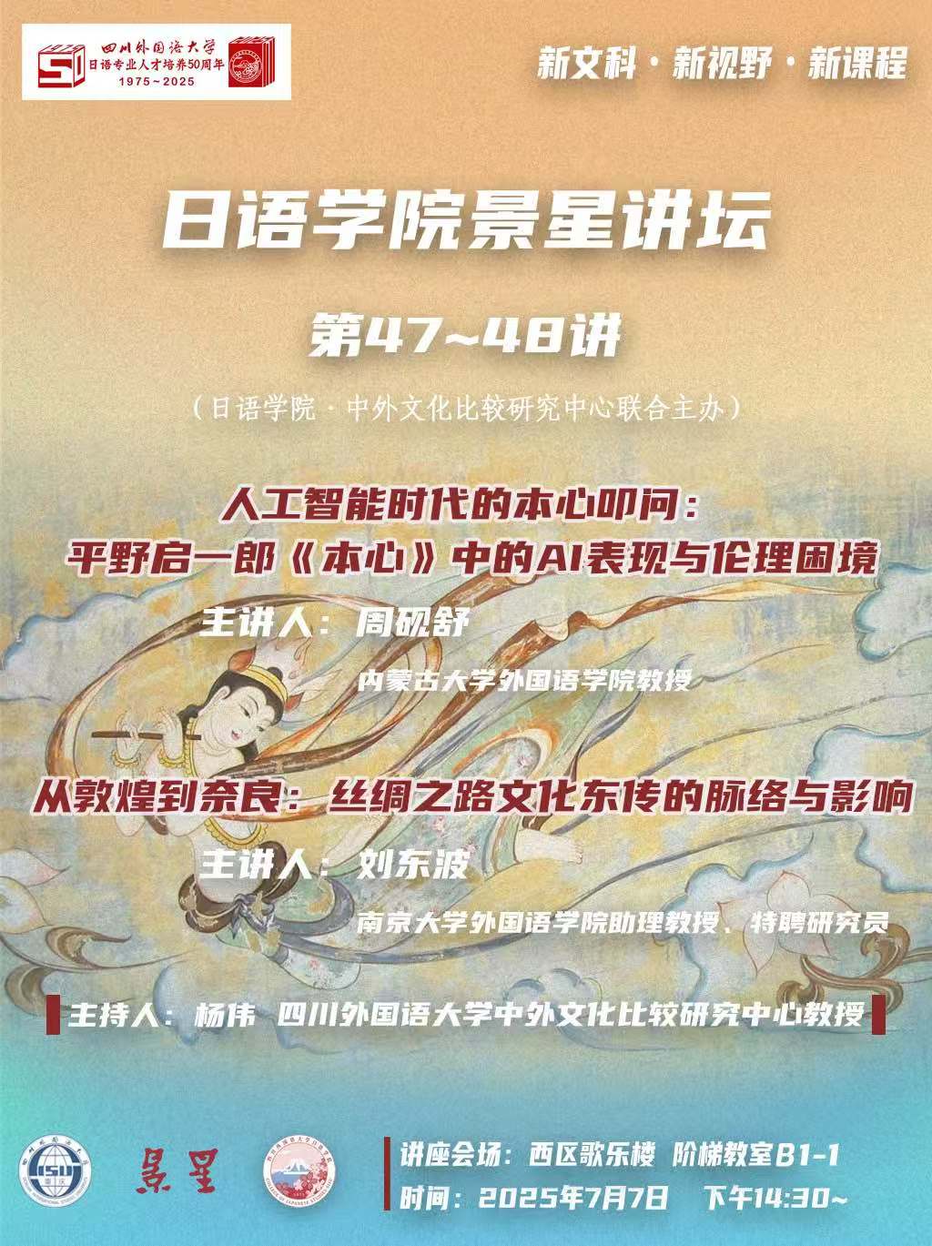 7月7日下午两点半,由太阳成集团tyc33455cc与中外文化比较研究中心联合主办的“景星讲坛”第47-48讲在公司西区歌乐楼阶梯教室B1-1成功举行。本次讲坛特邀内蒙古大学外国语公司教授周砚舒、南京大学外国语公司特聘研究员刘东波担任主讲人,由中外文化比较研究中心教授杨伟担任主持人。日语专业在校本科生、研究生以及部分专业教师参加了此次学术活动。
