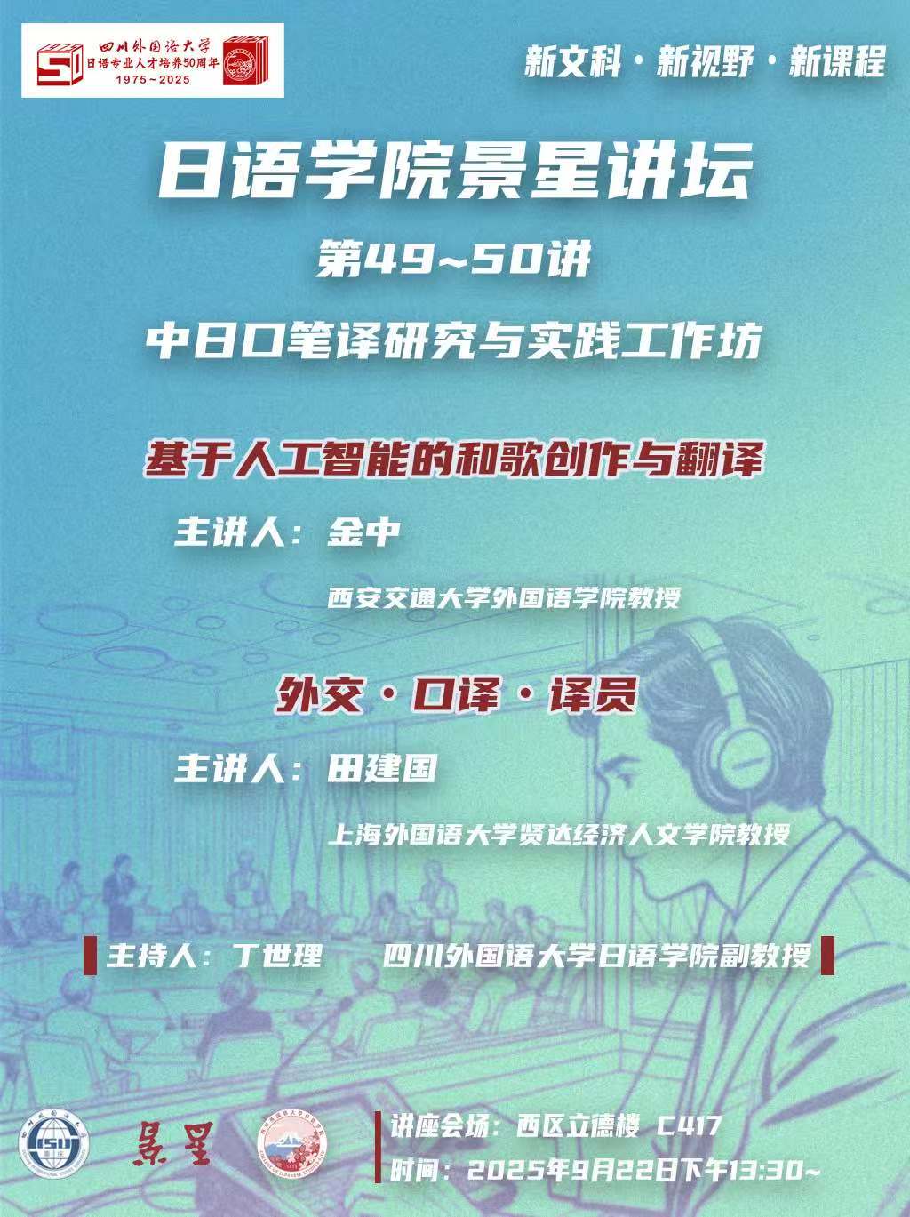 9月22日下午,太阳成集团tyc33455cc景星讲坛第49-50讲在立德楼C417举行。本次讲坛特邀西安交通大学外国语公司金中教授及上海外国语大学贤达经济人文公司田建国教授担任主讲人,讲座由公司丁世理副教授主持。日语专业在校研究生以及公司MTI研究生导师参加了此次学术活动。