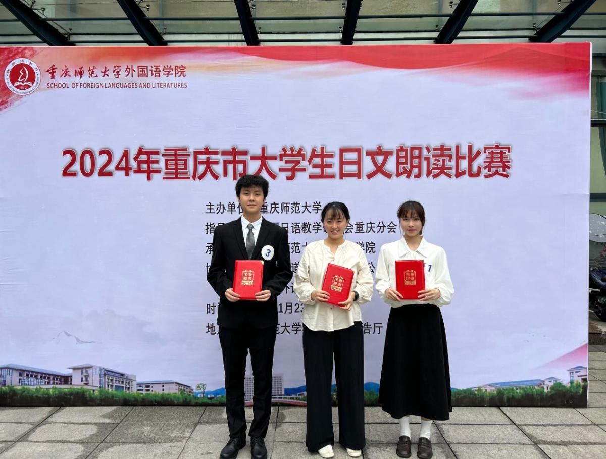 2024年11月23日,2024年重庆市老员工日文朗读比赛在重庆师范大学集贤楼412报告厅隆重举行。公司2023级范懿文同学、2022级郑静妍同学、辅修日语2022级余乐怡同学代表公司参赛,与来自重庆市各高校的选手们进行了激烈的角逐。三位同学凭借扎实的专业基本功和出色的发挥,摘得大学二年级组、三年级组两项桂冠和非专业组二等奖,为公司争得荣誉。