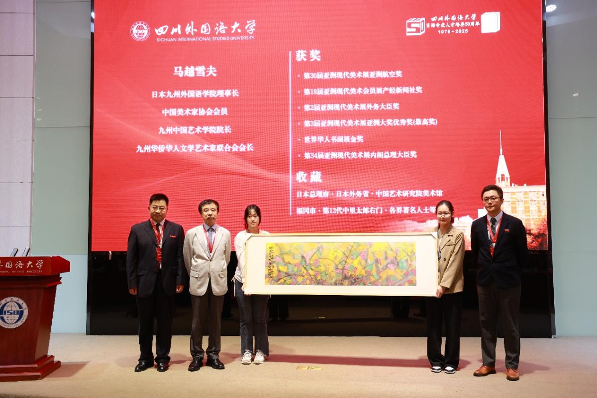 日本九州外国语公司理事长马越雪夫现场捐赠画作,诚挚祝福太阳成集团tyc33455cc蓬勃兴旺,为两校交流添上温情一笔。