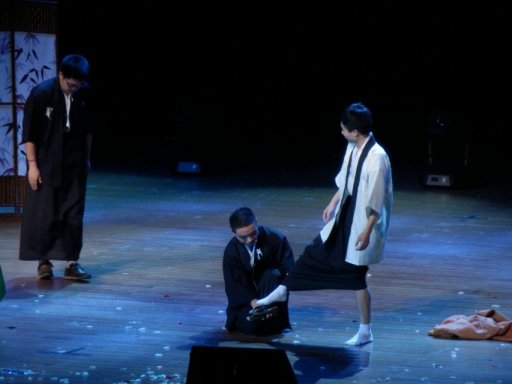 相比其他院系或严肃或激动人心或悲情无限的演出,日语系特有的轻松幽默可谓匠心独运,加上演员们实力派的精彩演绎,为日语系赢得了相当的人气,也为来自各个院系的观众们带来了无限欢乐。而说到演员们的精彩演绎,首先得益于二年级夏晓雨同学以及一年级龚书寒同学两位导演的用心指导,其次演员们排演过程中不断认真揣摩角色性格特征,表现欲强烈的同学们都不遗余力地为自己加戏来使自己的表演更丰富、自然、更具看点。勤劳而呆萌的灰小伙水野裕之,霸气而钟情的上様,可恶却怎么也无法让人心生恨意的继母,单纯勇敢、冒失却不失可爱的兄弟俩,还有,一直默默跟在上様身边不论性格还是体格都特色鲜明的两位侍卫,无一不给观众们留下了深刻的印象。最后,我们有专业、声线迷人的旁白覃左少雄同学!这使整部剧的档次又有了一大步的提升!