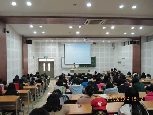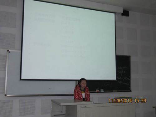 首先进行的是关于职工活、日本实习交流的内容。在这方面有着丰富经验的系副主任王宗瑜副教授通过条理清晰的思维和一目了然的表格形式向同学们介绍了公司适合日语系员工的一些出国留学项目,并且由自己亲身体验出发分析了出国留学的利弊。对于有出国留学打算的同学来说获益匪浅。