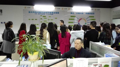 首先来到的是新闻生产内容办公场所重地——视听中心,放眼望去,这是一个很大的开放式办公空间,每个人都有独立工作平台;工作人员大都是20~40岁以下充满活力的年轻人。中心的赵女士也是川外毕业生,她给师生们生动详尽地讲解了华龙网制作一系列精彩视频的制作过程。随后参观了主要从事外语文字编辑工作的新闻中心、企业文化展示墙、新闻资讯播发与监管中心,相关负责人员都热情洋溢地向同学们介绍该部门的职能和运作方式。