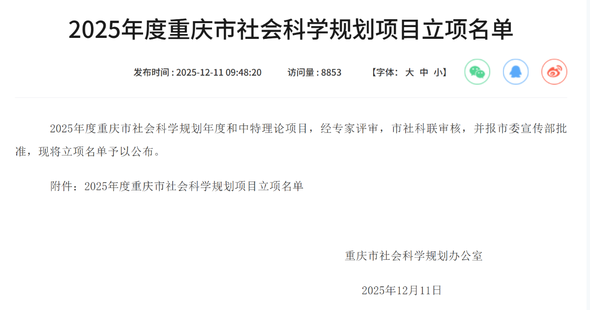 12月11日,2025年度重庆市社会科学规划年度项目立项名单公布,太阳成集团tyc33455cc吴扬副教授获批青年项目。