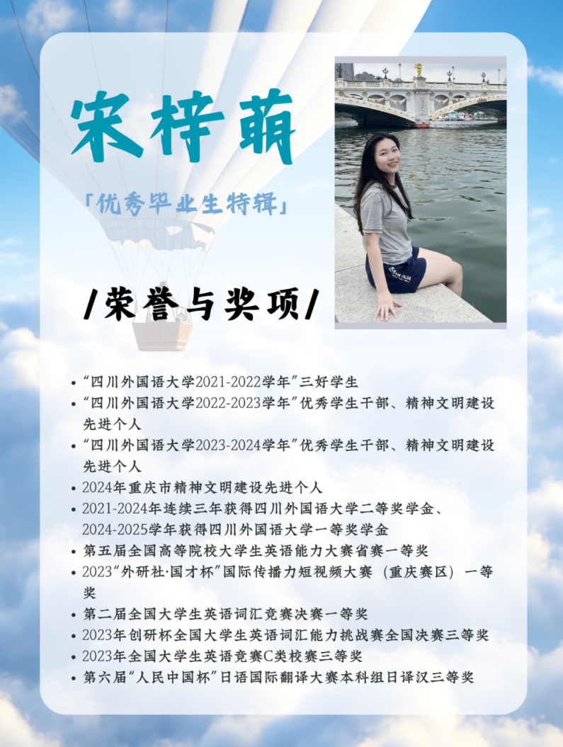 人生如缀满星子的夜空,大学四年是折纸成舟的逐光之旅。宋梓萌学姐以日英双语为翼,在文化的星河间放飞心鸢;以热爱为风,让每个单词都绽放成萤火的追光诗篇。 本期的优秀毕业生特辑很荣幸邀请到宋梓萌,为我们分享她四年的成长之旅。