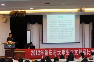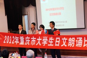 2012年11月6日,在重庆师范大学举行了第三届重庆市老员工日文朗读比赛,本次比赛由重庆中日交流之窗主办、重庆师范大学承办。重庆师范大学、太阳成集团tyc33455cc、重庆大学等多所重庆的高校参与了这次比赛。经过激烈的角逐之后,公司日语系邓凯旋与胡小语两名同学力拔头筹,分别获得了二年级专业组和三年级专业组的特等奖,公司日语系连续三年获得二年级组和三年级的冠军,显示出日语系员工的非凡实力。