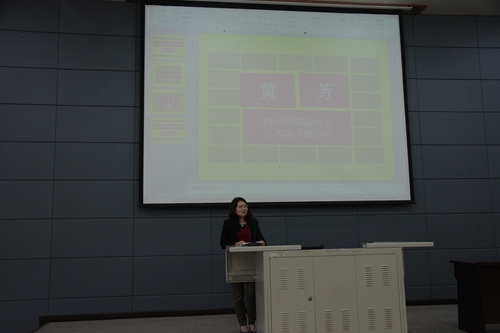 系主任黄芳副教授接着致辞,她在讲话中概述了日本文化节活动周中举办日本文化知识展板、员工手工制作、花道艺术与实作、日语演讲比赛、中日语言文化专家北语中心副教授秦刚先生、米村女士品谈日本著名动漫奇才宫崎骏大师的动漫艺术、日本知识竞赛、日本美食(寿司)品尝和深受师生欢迎的日语卡拉OK大赛等形式多样内容丰富的活动;体现了日语系师生的集体智慧和力量;十分珍惜和感谢日本重庆总领事馆的大力支持;衷心感谢公司领导的关心支持和有关部门的配合、感谢广大师生的辛勤付出和参与;我们今后再接再厉,努力提高举办日本文化节活动的广度和质量。
