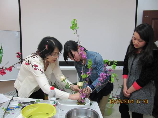 周三(3月26日)下午4点,日本国驻重庆领事馆总领事夫人光冈道子在日语系办公室进行了花道表演。道子夫人首先用寓教于乐的方式讲授了花道起源于中国,传入日本后根据日本人的喜好不断演变并得到蓬勃发展的历史,随后亲自演示了插花艺术,并现场教授同学们插花的技巧和秘诀。