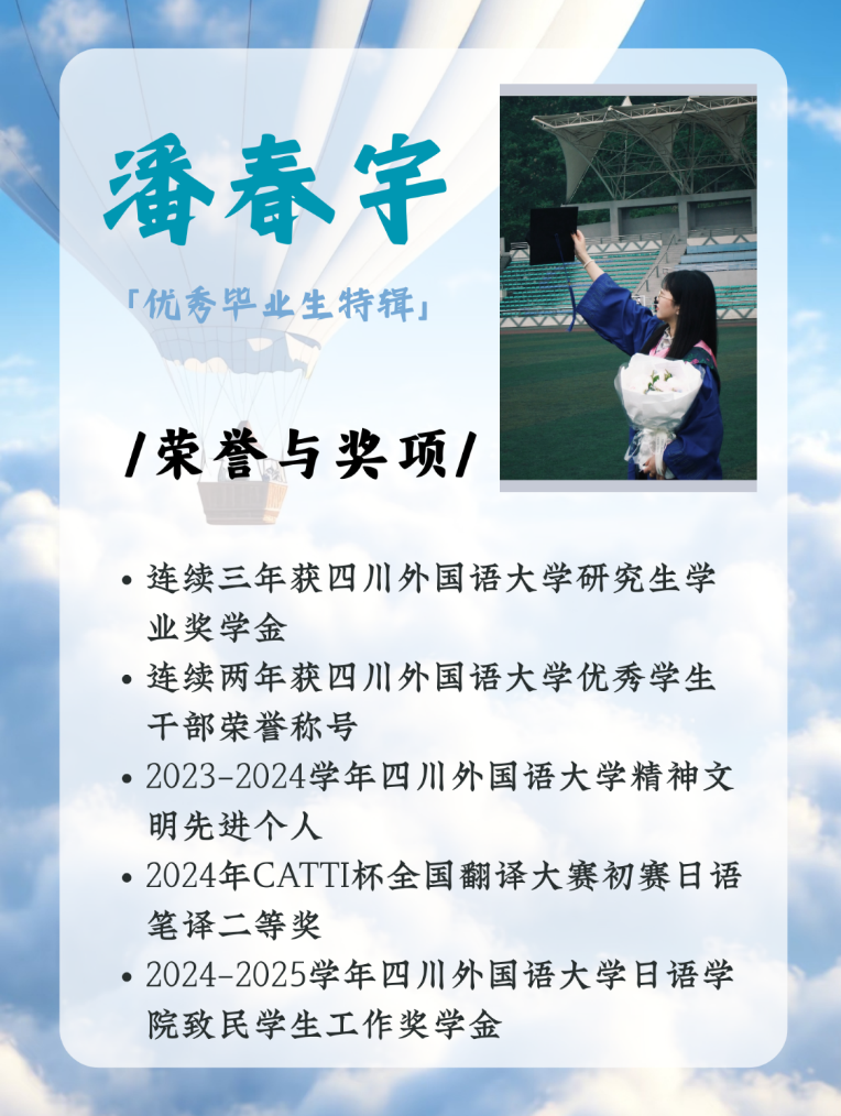 采访的最后,潘春宇坦言道研究生时期最大的收获应该是学会了如何自洽。相比本科期间还比较拧巴的自己,现在能够更客观地认识与评价自身,敢于相信自己去尝试未知的领域,敢于与人沟通与交流,也能够不盲从、不因外界声音扰乱自己的脚步,能够更从容地做自己。她感慨到,本科四年,研究生三年,这七年在川外的时光教会她成长,让她变成更好的人。千言万语在心中,值此毕业离别与母校75周年之际,汇成感恩与祝福二词。感恩相遇,祝福未来。