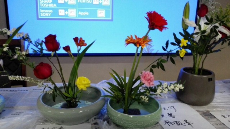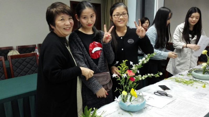 看到老师们的表演后,在座的同学们都跃跃欲试。由几位同学自由组成一个小组,在老师们的精心指导下,同学们齐心协力,更加求真求实地点点滴滴地用心琢磨,搭配花枝挑选花种花型花色,一番努力之后,各组渐渐共同完成了本小组的插花作品。对于同学们的习作,王老师一一对各组作品的好与不足进行了点评,并鼓励同学们更多地实践,创作出能展现自己想法和审美情趣、审美价值的作品。对于并不懂得花道插花技巧的同学们来讲,通过这个活动,我们不仅要掌握插花的技巧,更是要加深对花道的理解,加深对于日本文化的了解和理解。要做到更多更深地体会日本花道文化,学习掌握好日语是最重要的手段和前提。